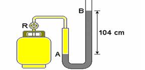 Uma pessoa, com o objetivo de medir a pressão interna de um botijão de gás contendo butano, conecta à válvula do botijão um manômetro em forma de U, contendo mercúrio. Ao abrir o registro R, a pressão do gás provoca um desnível de mercúrio no tubo, como ilustrado na figura.